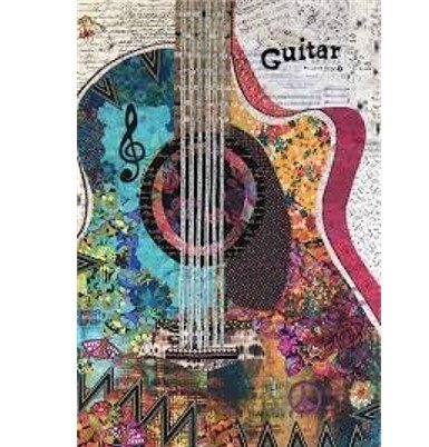 Guitar Collage Pattern by Laura Heine. This Guitar is ready to make music in your home with the vibrant blues pinks oranges browns and floral. Finished size 23x36